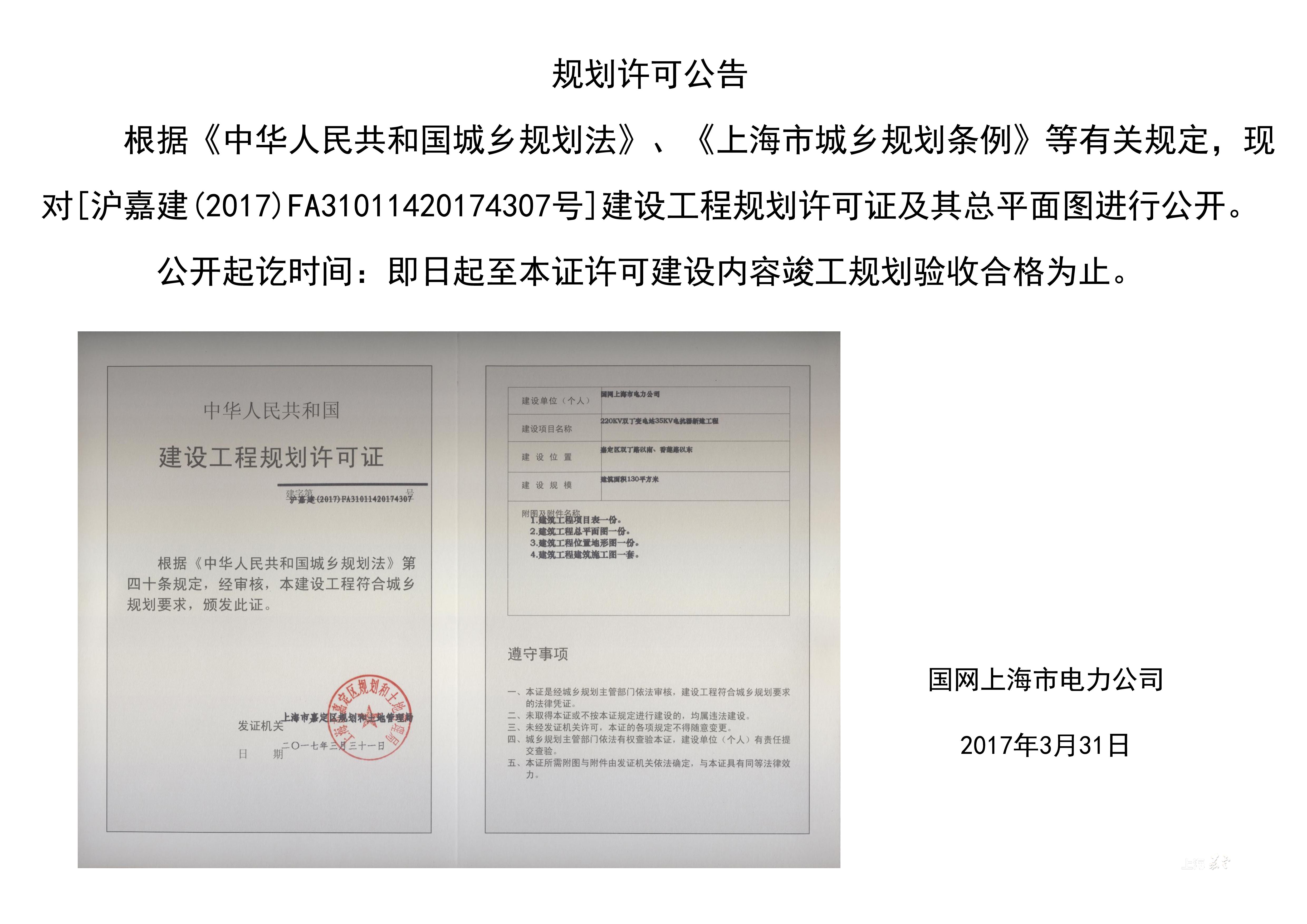 沪嘉建(2017)FA31011420174307规划许可公告