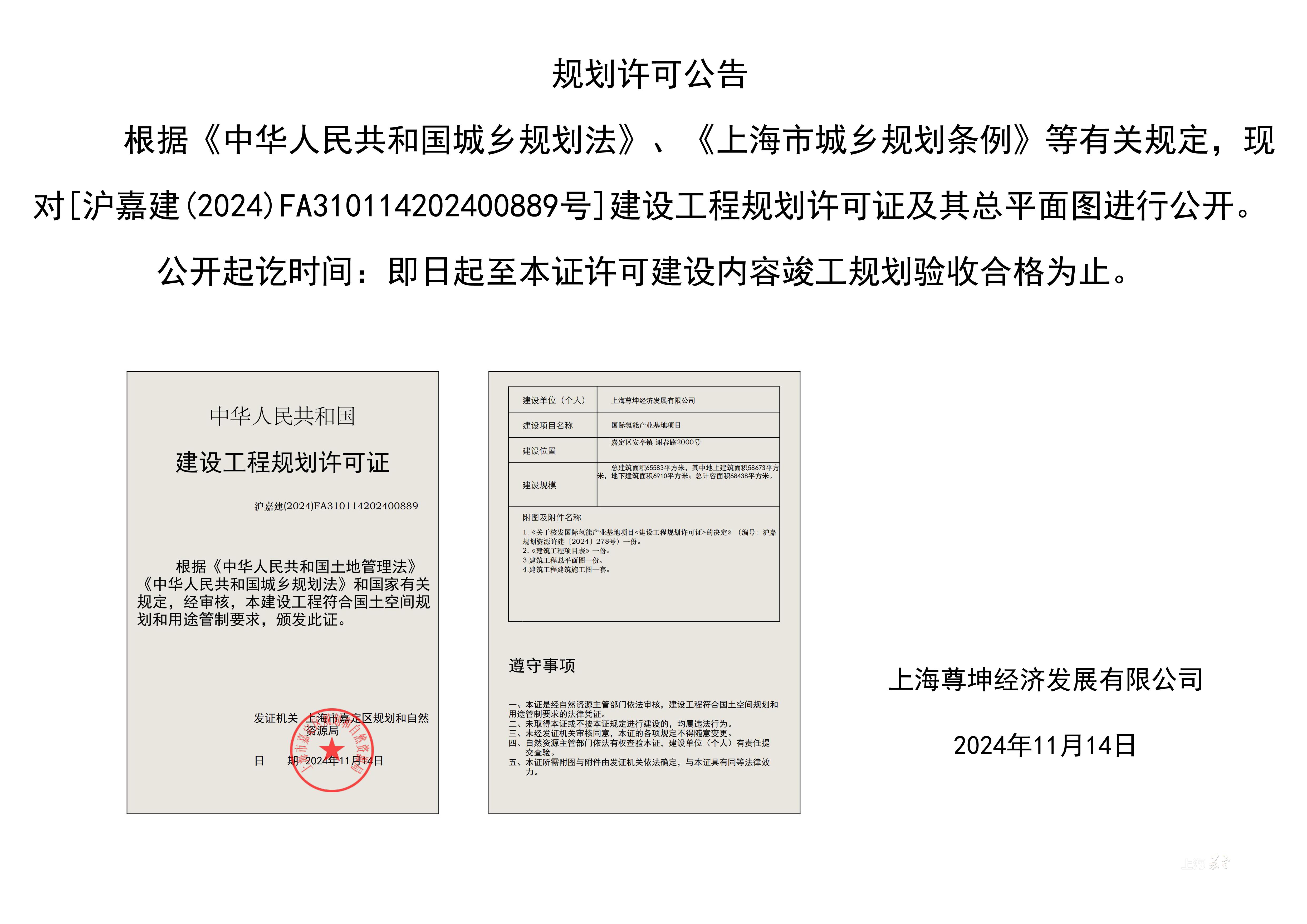 沪嘉建(2024)FA310114202400889规划许可公告(上海尊坤经济发展有限公司)