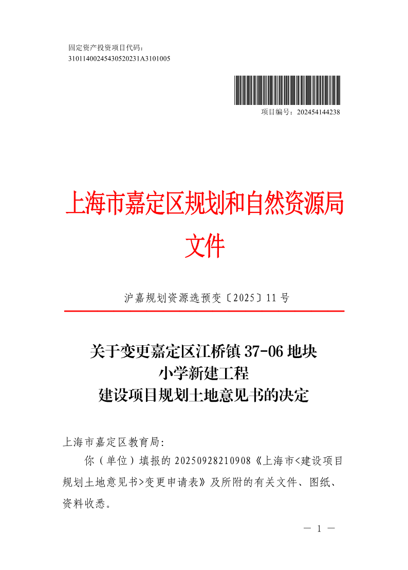 关于变更嘉定区江桥镇37-06地块小学新建工程建设项目规划土地意见书的决定(沪嘉规划资源选预变〔2025〕11号)