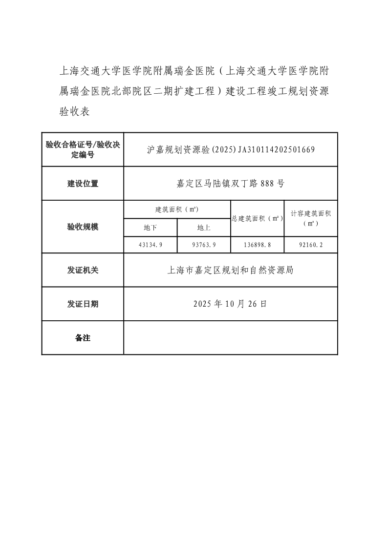 沪嘉规划资源验(2025)JA310114202501669竣工规划资源验收表(上海交通大学医学院附属瑞金医院)