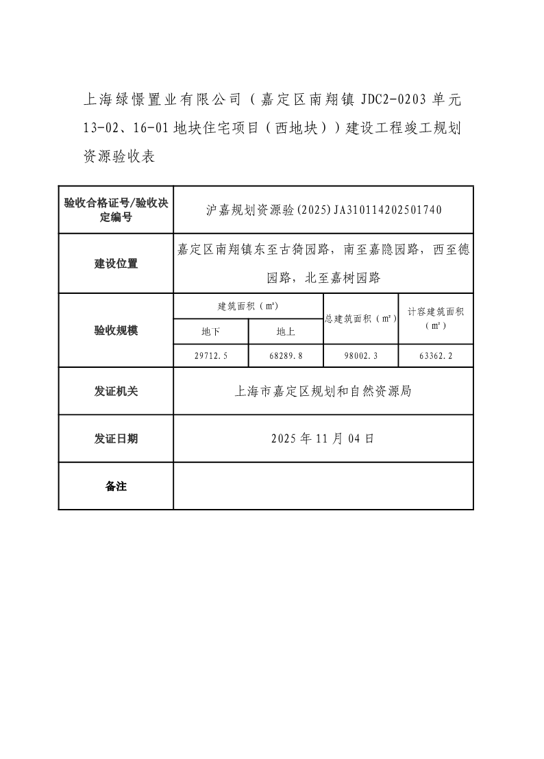 沪嘉规划资源验(2025)JA310114202501740竣工规划资源验收表(上海绿憬置业有限公司)