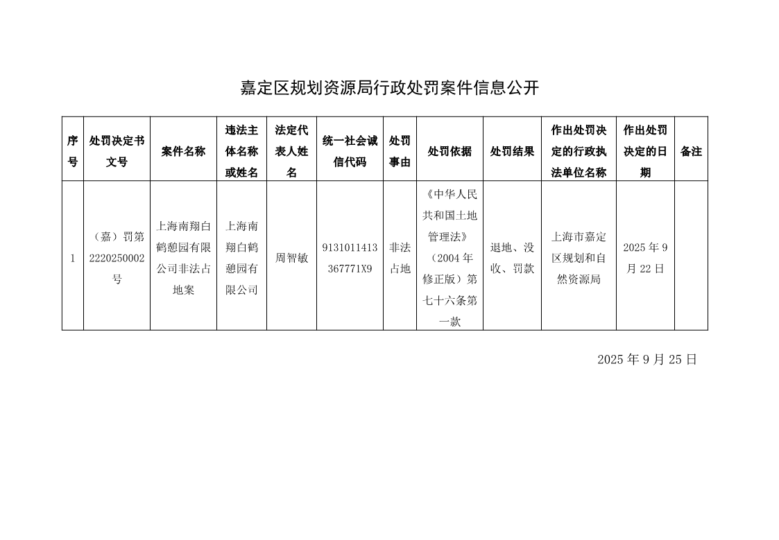 上海南翔白鹤憩园有限公司非法占地案(嘉)罚第 2220250002 号