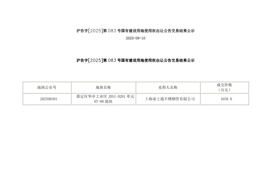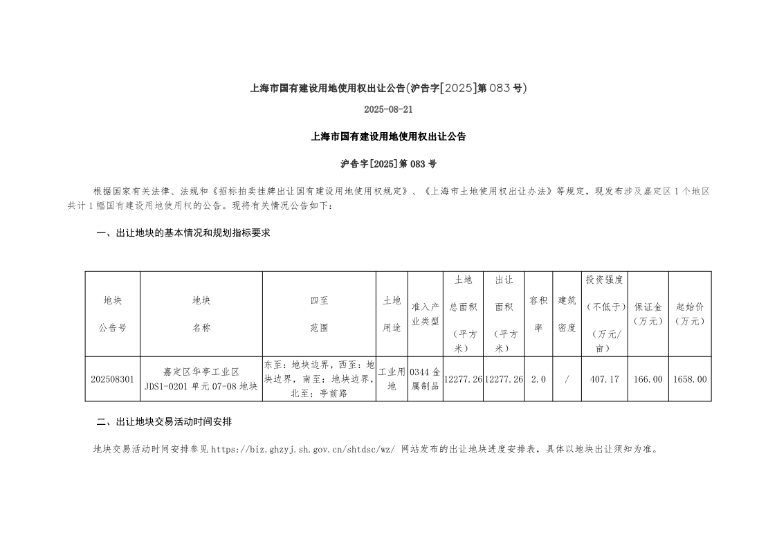 索引号: 00001434-9/2025-00000316 发布机构: 区规划资源局 发文日期: 2025年09月10日 文 号: 沪告字[2025]第083号 关键词: 华亭工业区 主题分类: 国有土地使用权和矿业权出让领域 嘉定区华亭工业区JDS1-0201单元07-08地块(沪告字[2025]第083号)国有建设用地使用权出让 发布时间:2025-09-10 浏览次数: 次 【字体:小 大】