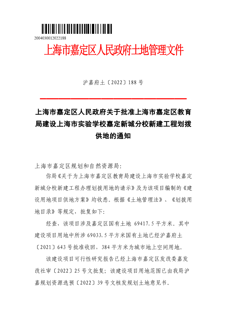 索引号: 发布机构: 区规划资源局 发文日期: 2022年08月30日 文 号: 沪嘉府土〔2022〕188号 关键词: 主题分类: 用地审批 上海市嘉定区人民政府关于批准上海市嘉定区教育局建设上海市实验学校嘉定新城分校新建工程划拨供地的通知(沪嘉府土〔2022〕188号) 发布时间:2022-08-30 浏览次数: 次 【字体:小 大】